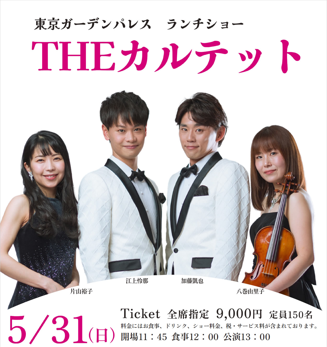 | 開催時間 | 【開場』11:45/【食事』12:00~/【公演】13:00~ | 販売価格 | 9,000円(税サ込) ※食事、ドリンク、コンサート料金含む |